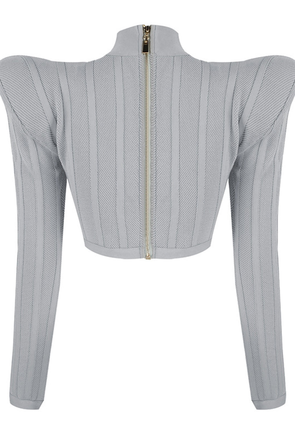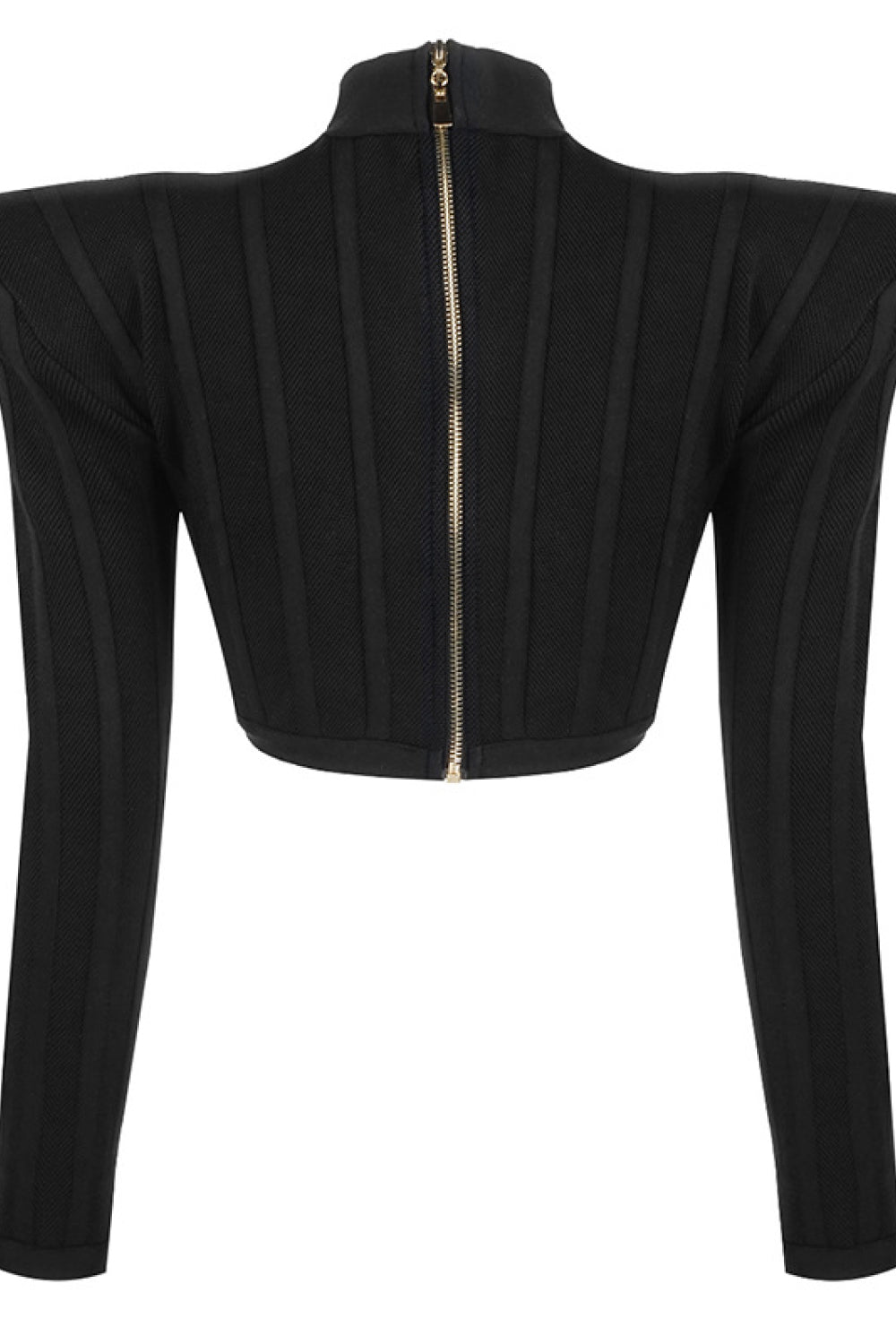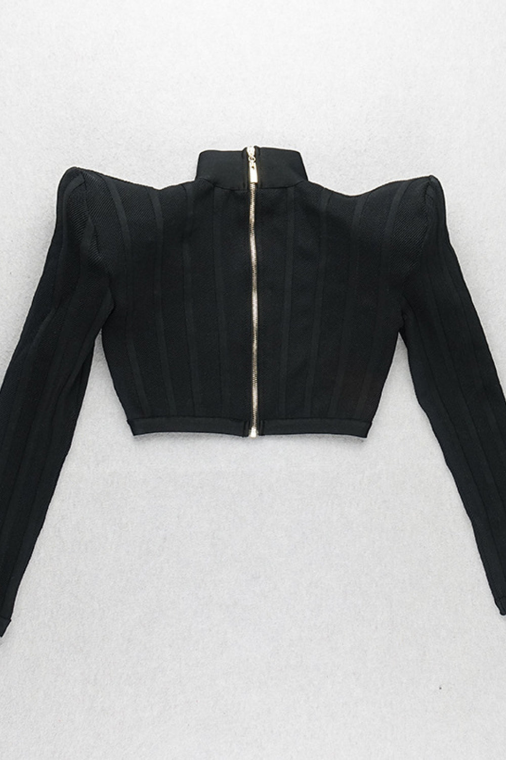 - Features: Long sleeve, padded shoulder, cropped, zip back