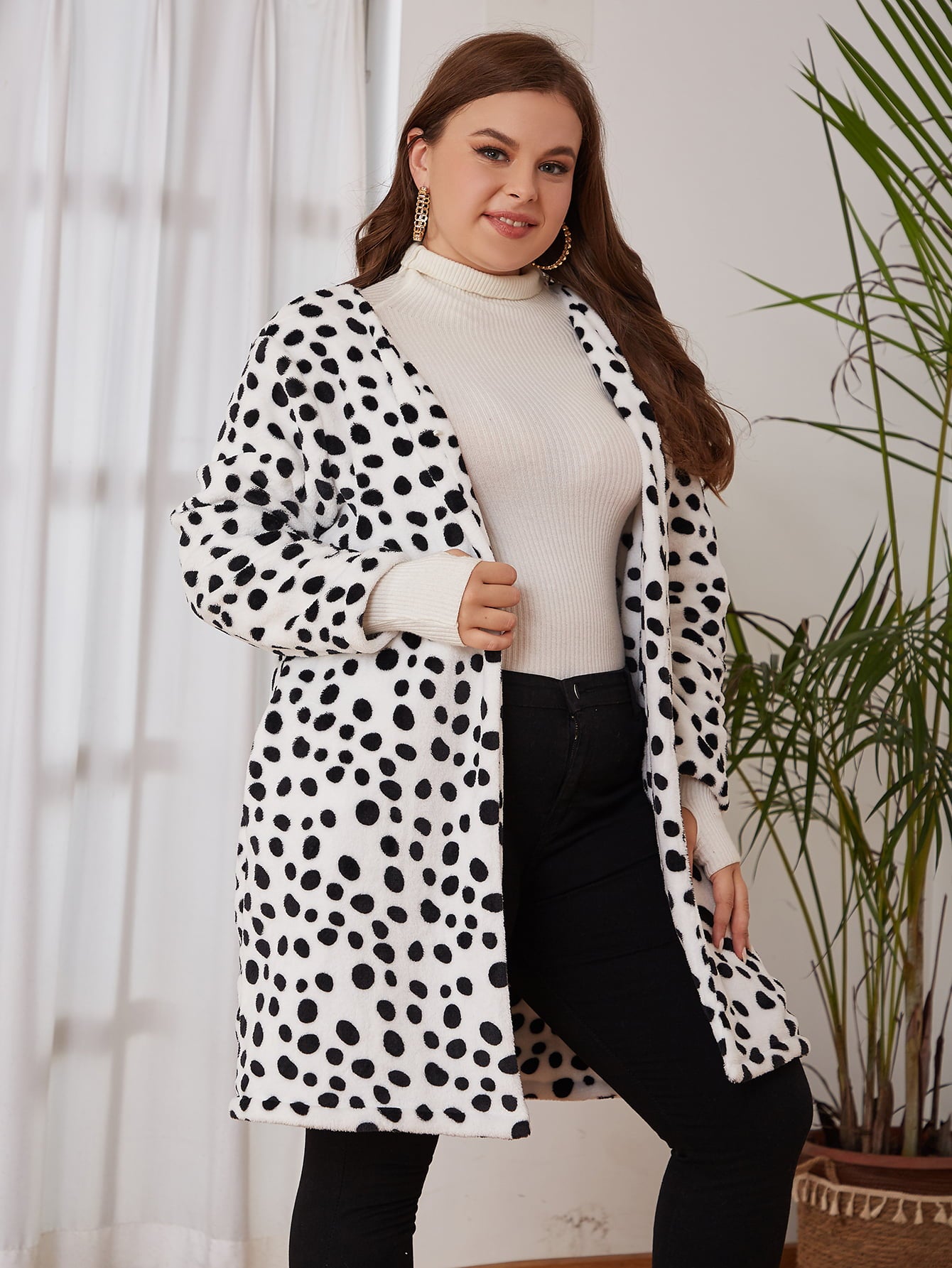 Plus Size Polka Dot V-Neck Fleece Jacket