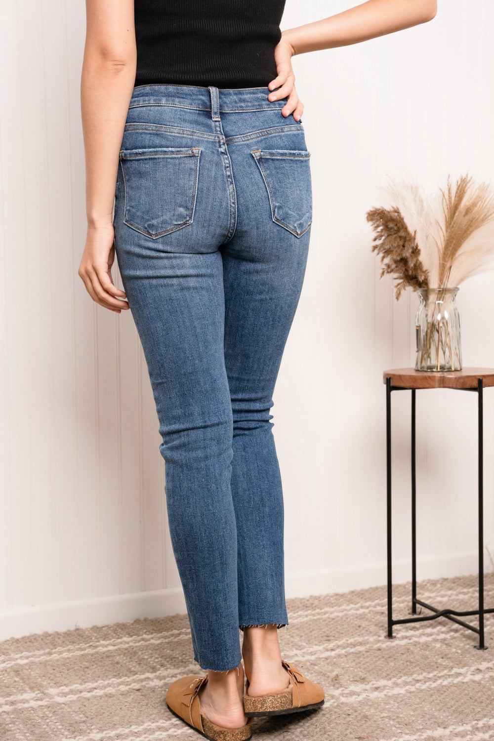 RISEN Full Size Asymmetrical Waist Raw Hem Jeans in Dark