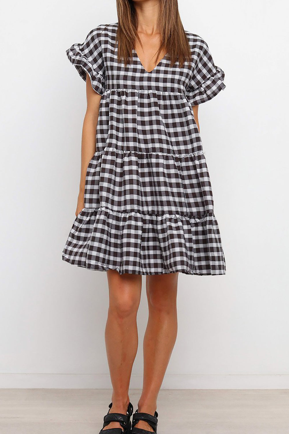 • Load image into Gallery viewer, Ruffled Plaid Tiered Swing Dress