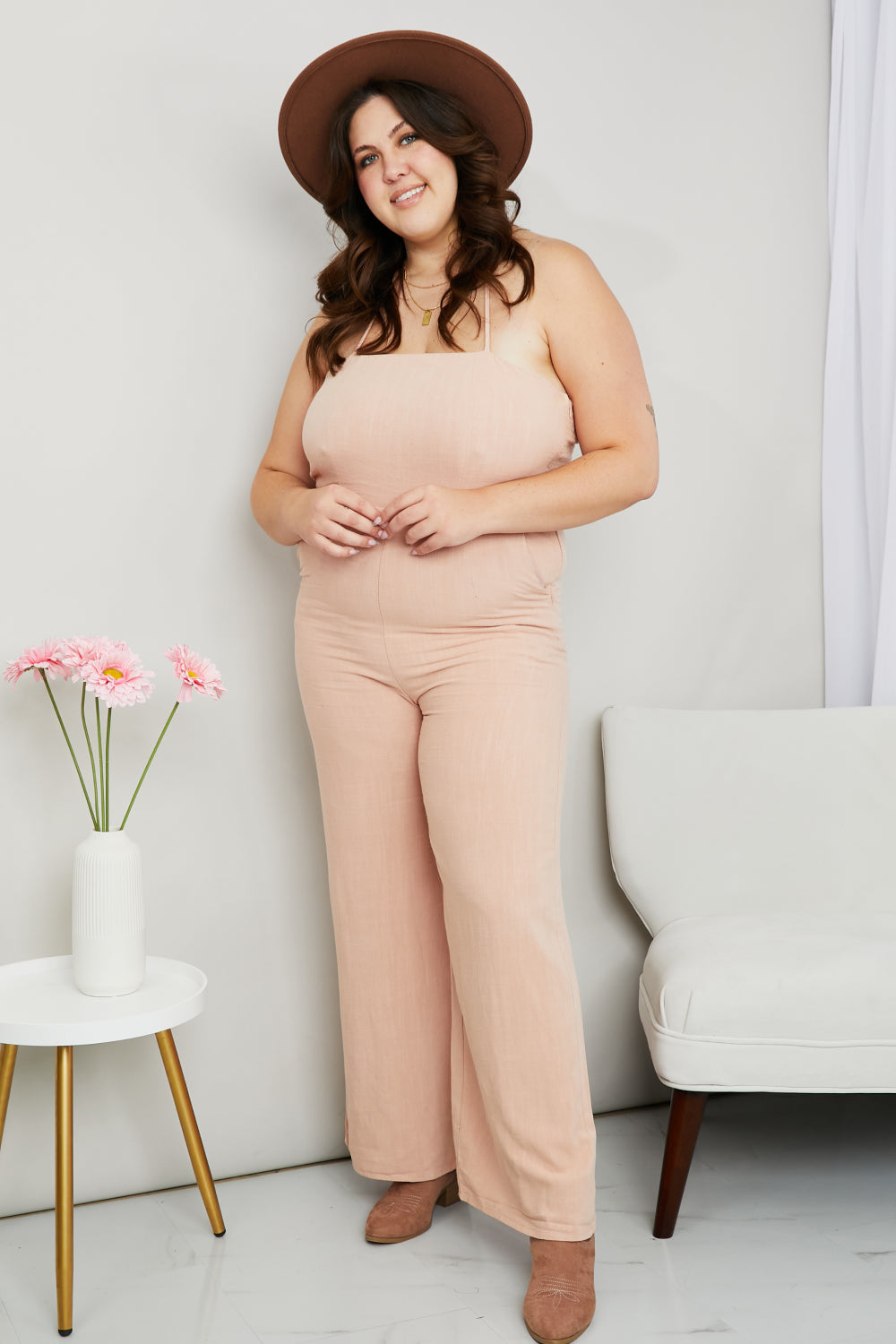 This jumpsuit is the perfect addition to your closet. The fun halter neck, pockets, and smocked detail make this a must-have item. It's perfect for any occasion.